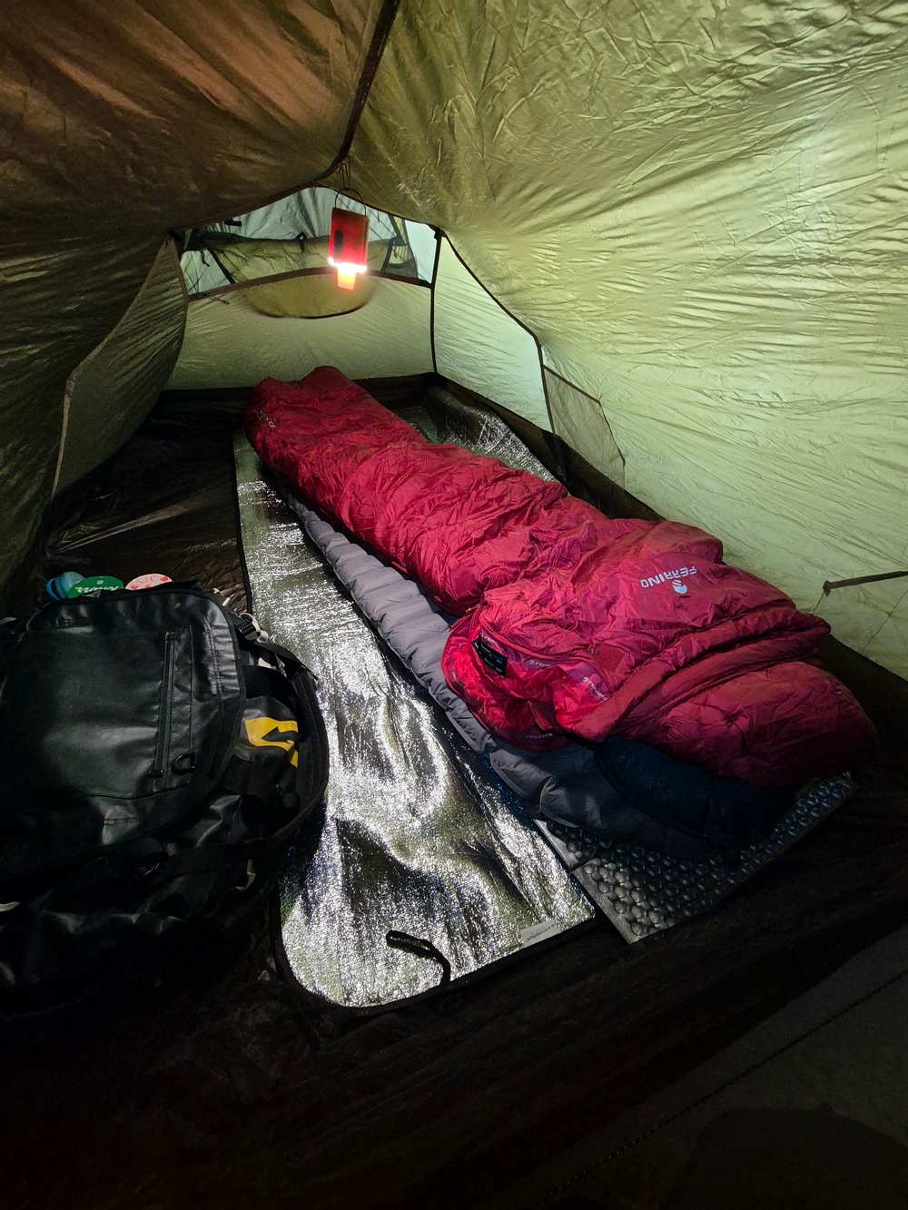 Magamiskotiks sünteetilise täidisega Ferrino NIGHTEC 800. -34/-14/-7/+15°C; 2300 grammi. Seljakotis ei tassi, aga auto või kelguga võib vedada küll. Pakkekotist tuleb lups välja, aga tagasi maadled. Öise -11 kraadiga oli väga mõnus magada. Üllatavalt palju siseruumi ning suur sisekrae ei lase sooja välja ega külma sisse. Ühe käega regullitavad kapuutsi ja sisekrae pingutusnöörid. Ühesõnaga – väga 5 kott, kui pikalt seljas ei pea vedama.