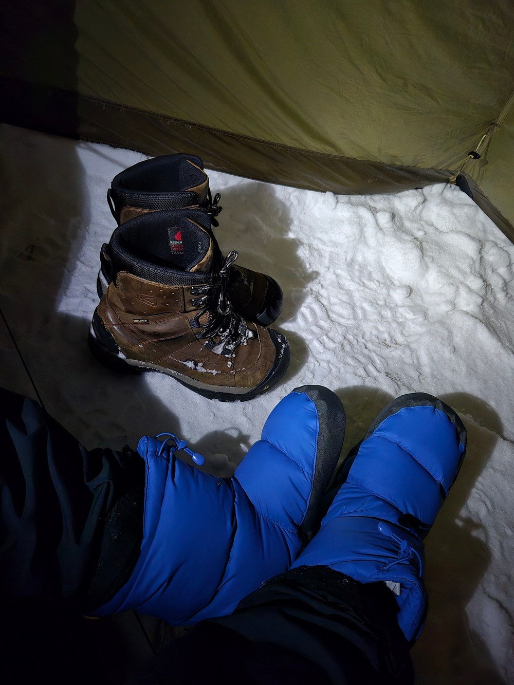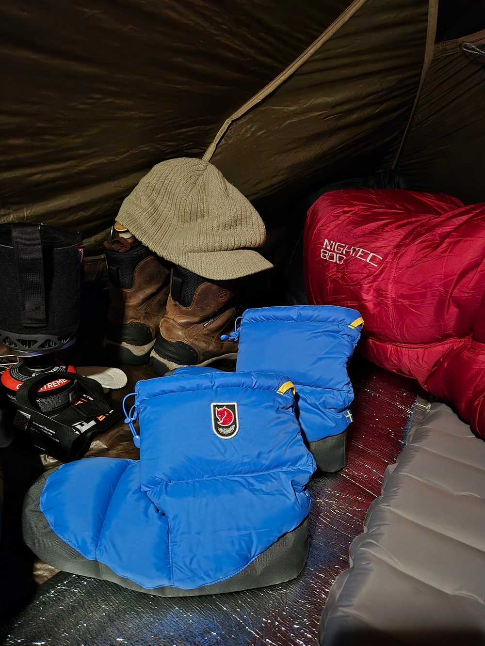 Fjällräven EXPEDITION DOWN BOOTIES sulesussid. Esmapilgul ehk veidi kallis tilu-lilu, aga reaalses elus pigem hädavajalik. Matkaniiske ja lumise saapaga telgis ei istu ning talvel on ka väga soojade sokkidega telgis jahe toimetada. Sulesussid on mõnusad soojad “päntad” millega kannatab ka väiksemad sammud lumel teha. Midagi tuua-viia või vetsus. Kaal: 225 grammi. Võtavad küll kotis ruumi ja kaaluvad, aga on seda väärt!