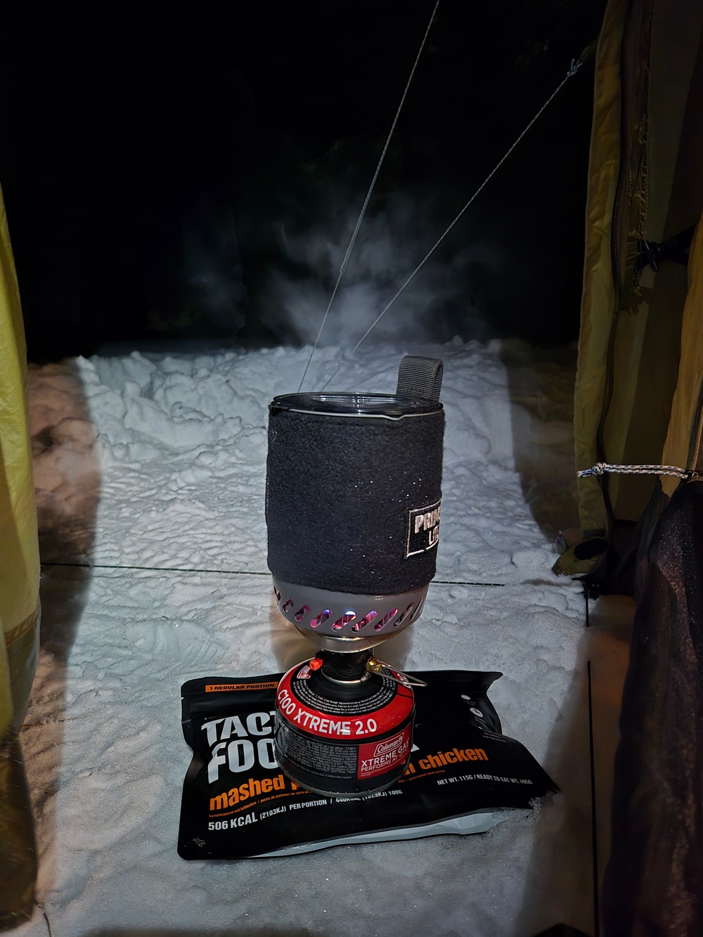 Köök: Primus Lite 0,5l “kõik-ühes” pliit. Väike gaas ja põleti mahuvad 0,5-liitrisesse soojusvahetiga potti. Kaal: 350 graami. Gaasid: talvised gaasid: Coleman C100 XTREME gaasipurk on ägeda kujuga ning mahub ka põleti külge keeratuna Lite 0,5 potti ära. Primuse enda väikese gaasiga paraku mitte. Gaas tuleb pakkides pliidi küljest lahti keerata. Coleman C300 X-Treme talvegaas oli kodus olemas. Võtsin igaks juhuks kaasa. Järgmisel korral võtan kaasa ka mingi alumiiniumist tüki, et gaasipurk ei peaks otse lumel olema ning alus pakuks lumel ka veidi rohkem stabiilsust kui Tacticali pakk 😉 Isolatsioonina töötab selline lahendus aga suurepäraselt.