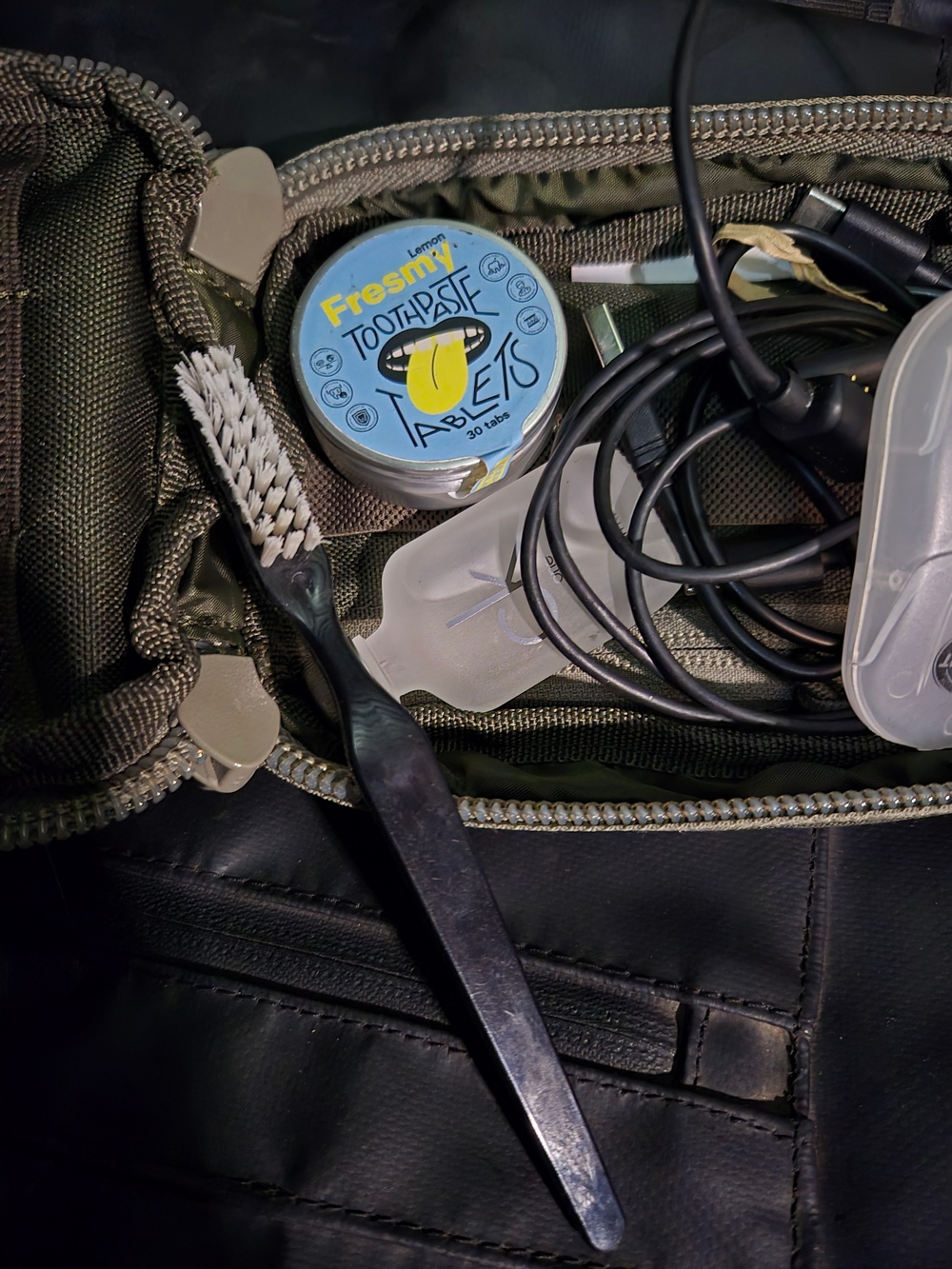 Hügieen: Mul on väike paun, milles on plaastrid, mõned rohud, laadimisjuhtmed, “puugikaart”, hambahari, Fresmy hambapastatabletid (kergemat, kompaktsemat ja külmakindlamat hambapastat polegi vist olemas) ja väike lõhn, et peale matka ikkagi bussi või rongi lubataks…